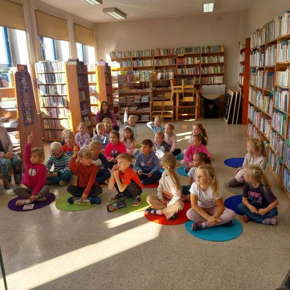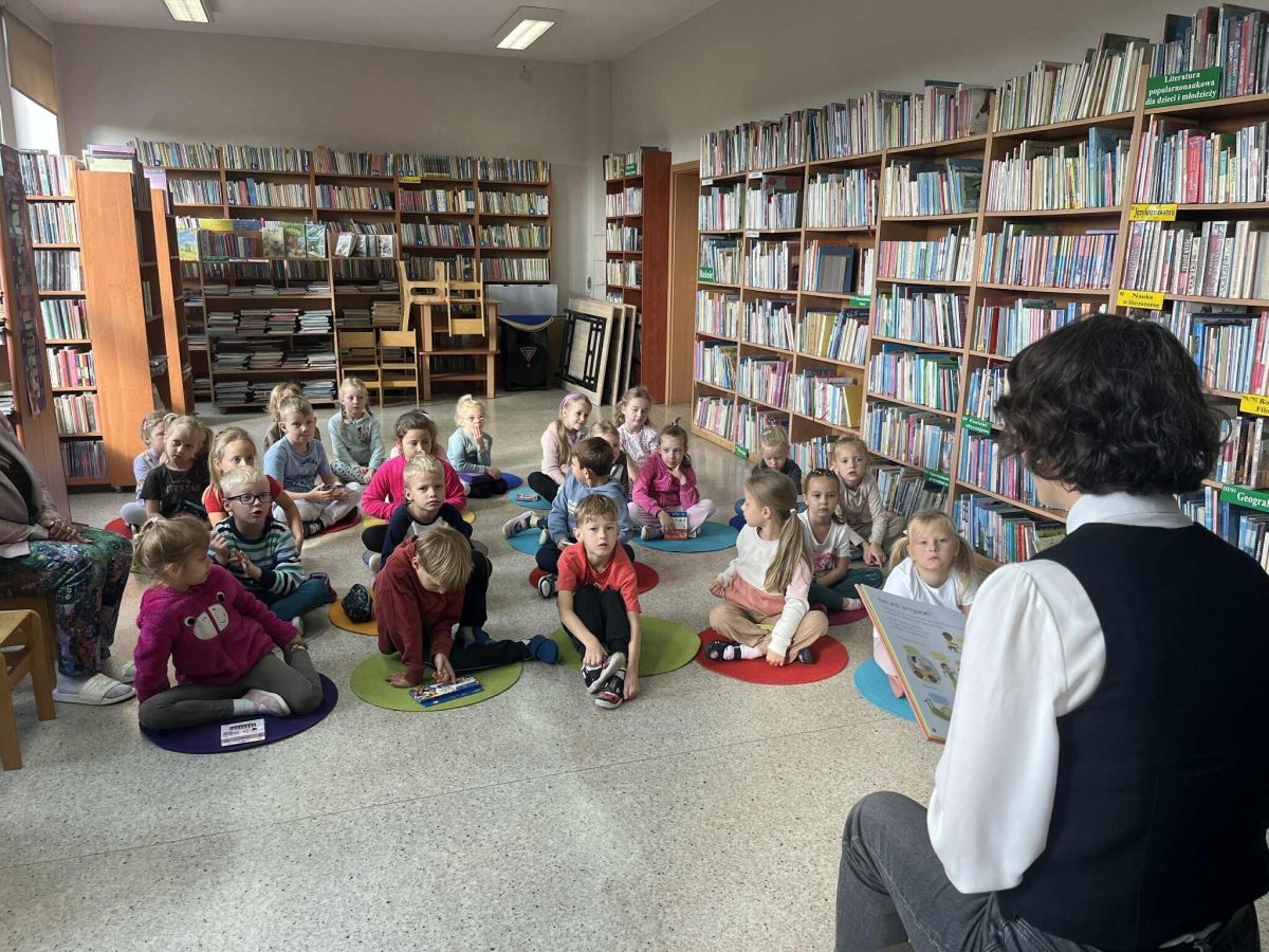 W środę 6.10.b.r. naszą bibliotekę odwiedzili uczniowie z klas 1-3 ze Szkoły Podstawowej w Hucie. Dzieci zapoznały się z zasadami wypożyczania książek, zwiedziły bibliotekę i uczestniczyły w lekcji bibliotecznej. Wysłuchały krótkich opowiadań z różnych dziedzin literatury, które nawiązywały między innymi do ortografii, przyszłych zawodów oraz jesieni. Miały okazję zapoznać się z różnymi książkami a chętne dzieci narysowały jak wyobrażają sobie jesień. Na zakończenie dzieci skorzystały z poczęstunku i otrzymały symboliczną pamiątkę z biblioteki.